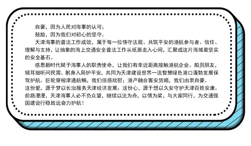 精心打造“七彩法治长廊”,通过框架搭建、案例剖析、条文讲解、互动体验等多种形式,深入阐述习近平法治思想的深刻内涵,展示海事法治建设成果,致力打造政府、企业、公众协同共治的法治宣传教育阵地。常态化开展“法律进船舶、进企业、进校园、进社区”等活动,持续送法入校、送法上船、送法助企、送法便民。坚持每月制作一期“以案释法”专栏,增强行业法治意识。聚力打造大港海事局“铁肩哨港”法治文化品牌,该品牌先后荣获第四届交通运输优秀文化品牌、“瞰北方江海十大优秀文化品牌”以及天津市第三批落实普法责任制优秀创新案例。